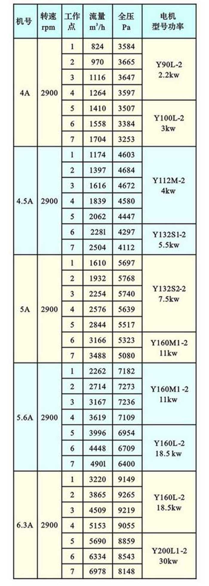 風量(Q):824 ∽ 63307M3/hr全壓(H):366 ∽ 676mmH2O柱機號:4# ∽ 16#傳動方式:A型:電動機與